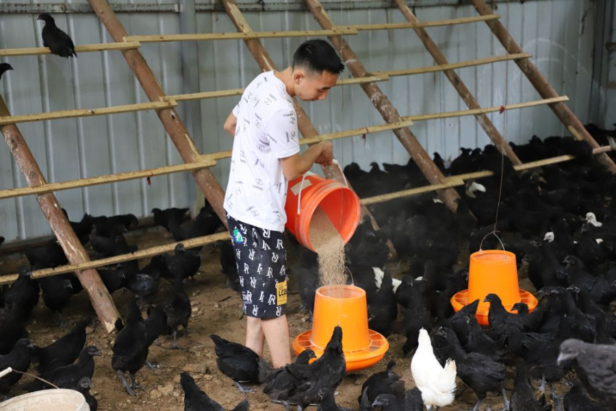 村民正在给乌骨鸡投食(2025年5月7日摄)。