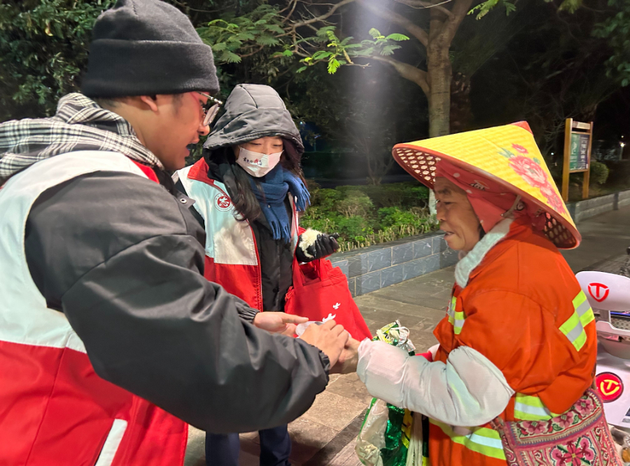 凌晨五点的蒙自街头,52岁的环卫工人郑丽转握着扫帚的手被冻得通红,在接过蒙自冬至文明实践志愿者递来的热汤圆时,眼眶泛起晶莹。“大姐,天冷,吃口热乎的!”这份带着浓浓温暖的善意,恰似这座城市文明里最温柔的注脚。