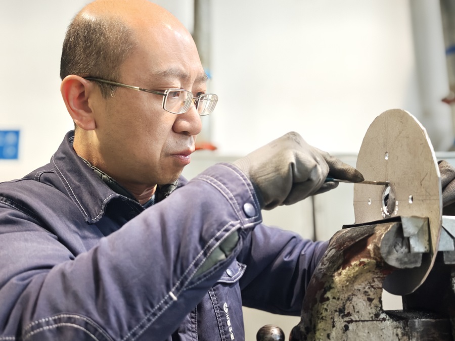 徐钟阳在制作倒立箱机构替换件(资料图)。