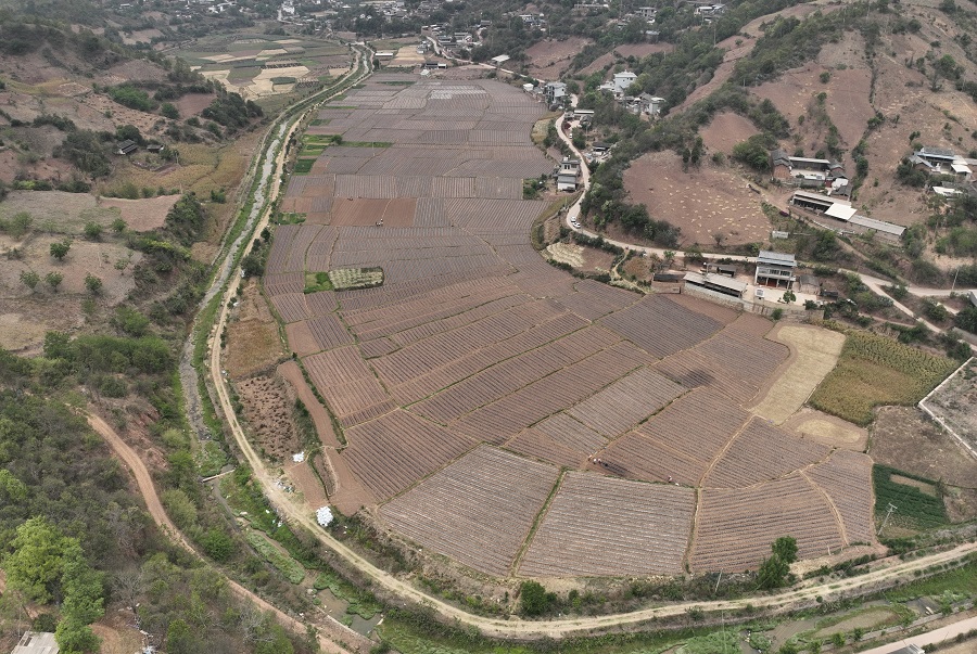 在云南省大理白族自治州巍山彝族回族自治县五印乡,连片的烟田铺展开来,一垄垄烟株整齐地向远山蔓延,一条条黑色的滴灌带缓缓延展。这里曾经遍布着零碎的坡耕地,如今已变成规模化的连片田。