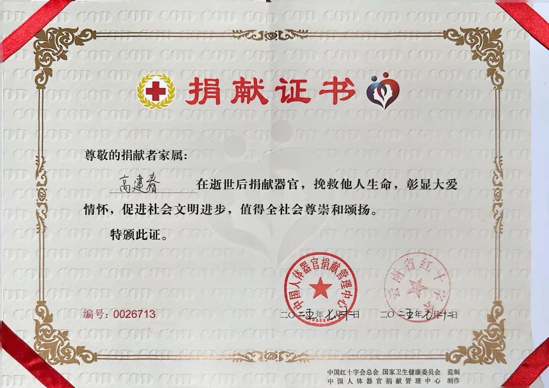 最终,高建春家属克服巨大悲伤,一致同意作出捐献高建春器官的决定,并于7月22日上午10时许,在有关人员和亲友见证下,在器官捐献相关表格上签字按手印,正式确认捐献。