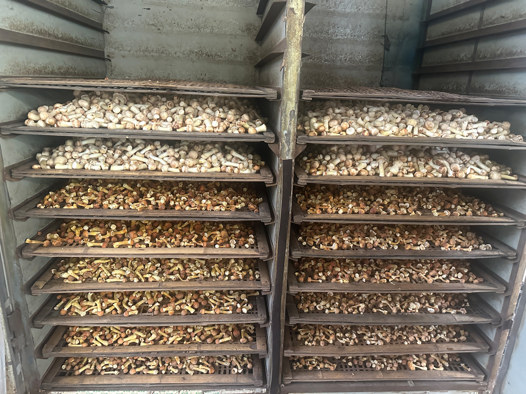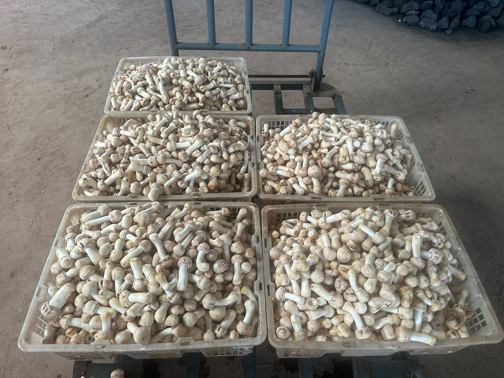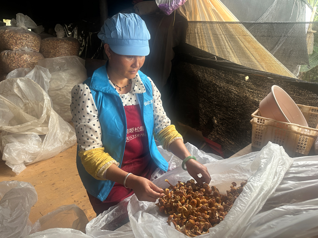 在姬松茸加工厂内,机器轰鸣声阵阵,工人们有序的开展着称量、清洗、分拣、包装等工作,现场呈现出一派忙碌的丰收景象。李文荣是厂内的菌子清洗工,他将一筐筐称好的姬松茸倒入清洗缸,不一会儿沾满泥土的菌子便被清洗得干干净净。“工厂运营之初我就在这里工作,每天会忙到凌晨,虽然辛苦,但能赚钱顾家两不误,我很满足。”李文荣表示。