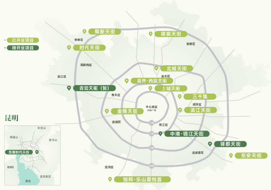 与昆明时代天街同期发布的成都驿都天街为龙湖集团在成都打造的第11座天街。该项目定位为“东郊品质生活新中心”,预计引入近300个品牌,其中超半数为区域首进。