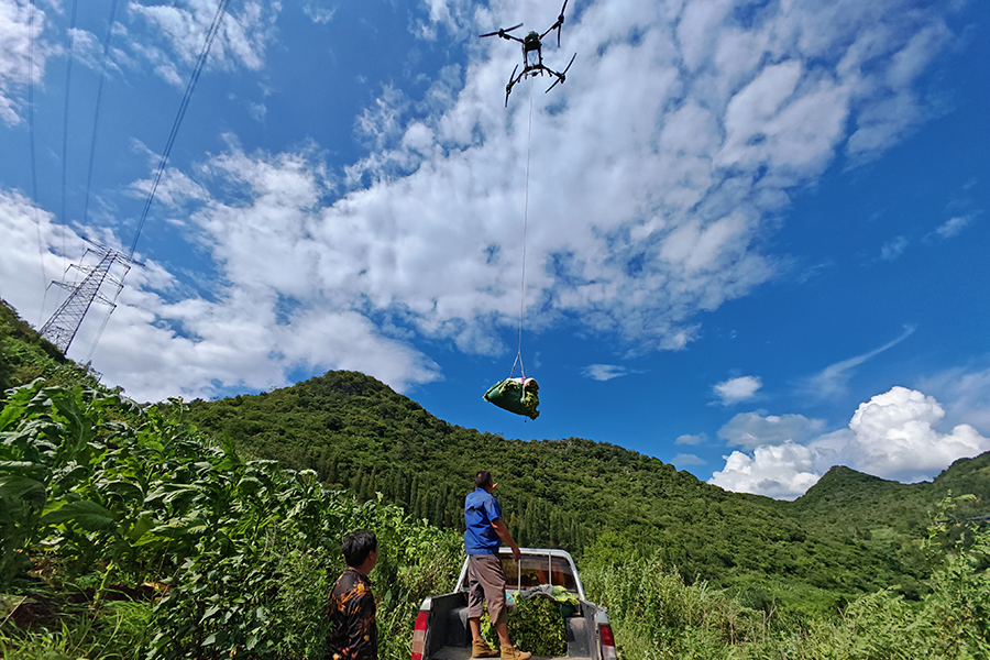 今年夏天,梁绍昌的烟叶随着一架无人机轻盈地掠过树梢,沿着预设的安全航线,精准地悬停在山坡下收集点上方,地面人员麻利地将一捆捆采摘下的新鲜烟叶从吊索上放到收集点的皮卡车上,几分钟就完成了以往需要壮劳力辛苦跋涉大半天的任务。此外,无人机运输极大降低了烟叶在崎岖山路颠簸中造成的损伤,保证了入烤烟叶的品质,间接提升了最终收益。
