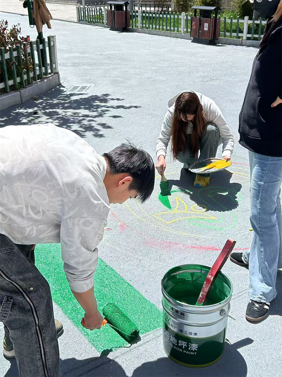 帮扶团成员为实验小学绘制地面游戏(资料图)。