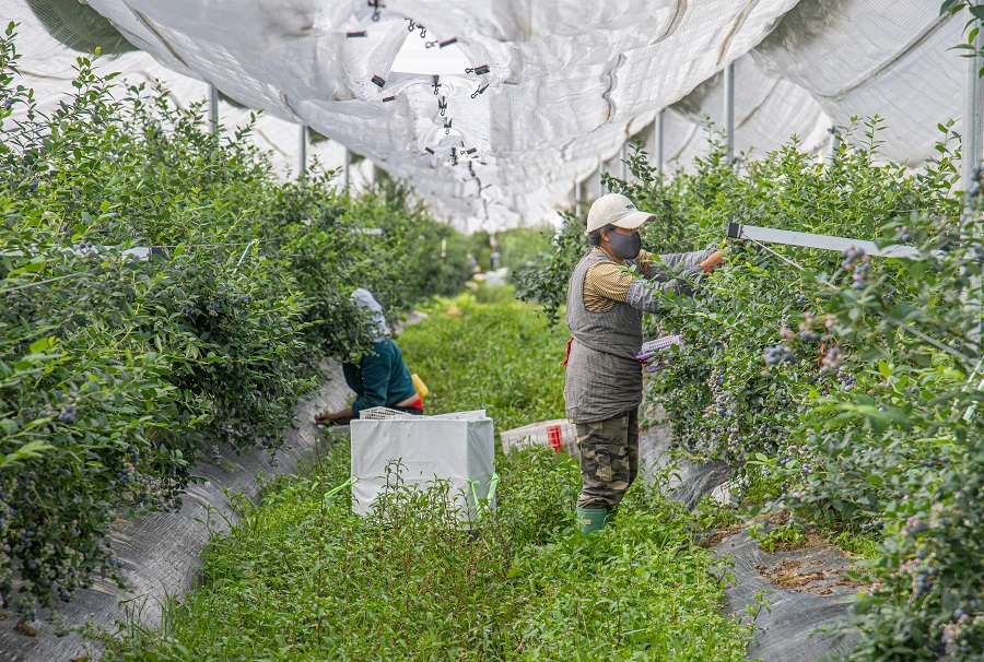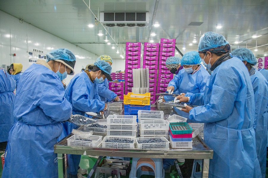 近日,在云南省怒江傈僳族自治州兰坪白族普米族自治县乡村振兴现代农业产业园种植基地里,饱满的蓝莓挂满枝头。从枝头采摘、车间分拣到精心包装,颗颗“金果果”经过严格挑选正走出大山,销往海内外。