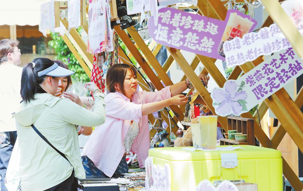 图为游客在云纺蓄电池厂文化创意园品尝美食、选购特色工艺品。