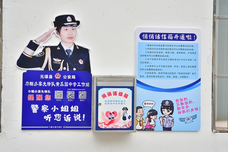 元谋县公安局联合教育部门在黄瓜园中学设立“悄悄话信箱”,由县公安局巾帼明灯工作室女民警专门负责,每两日开启一次,及时查看信件、发现孩子们的问题与需求,为未成年人提供隐私保护的心理疏导渠道,信箱设立至今已为未成年人妥善处理信件50封。
