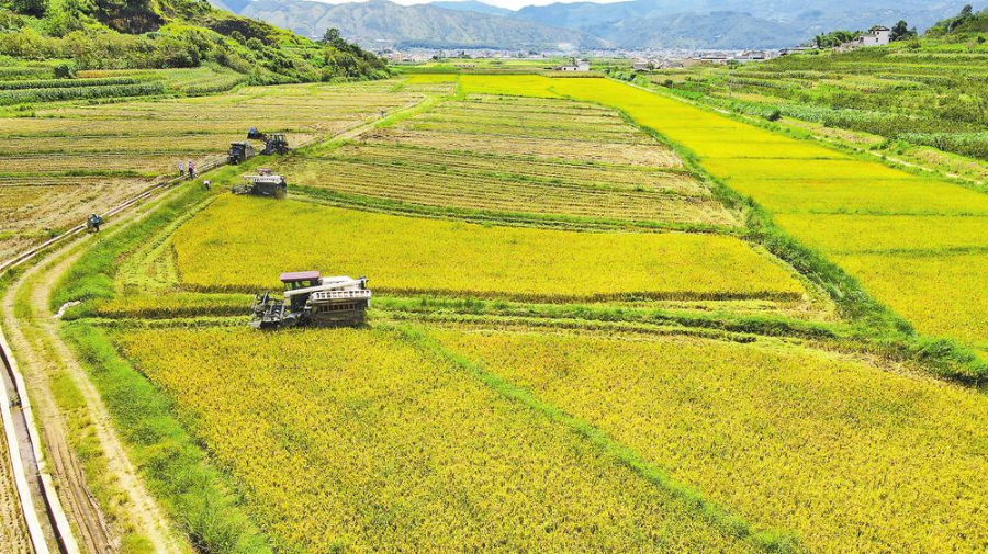 在何光龙家的繁育田里,沉甸甸的稻穗压弯稻秆,连片稻田被染成金黄。不远处,机声隆隆,到处是工人忙碌的身影,收割、装袋、拉运每个环节井然有序。何光龙从事水稻亲本繁殖已有7年,凭借丰富的经验,他把自家基地打造成当地的“高产样板”。“你看这片田,亩产700多公斤,细算下来,今年总产值应有150万元。”看着满眼金黄,何光龙笑意盈盈地说。