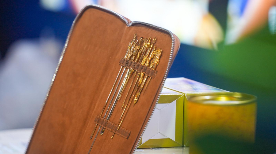 展柜上,百年传承的郑氏秘制中药骨伤药酒、拥有国家发明专利的骨伤散,以及系列艾灸产品整齐陈列,吸引不少参观者驻足了解。而其中最引人注目的,当属黄金打造的“黄帝九针”。独特的中医秘法让参观者们纷纷停下脚步,向工作人员咨询“黄帝九针”的特性与功效,对这一传统医学瑰宝充满好奇。
