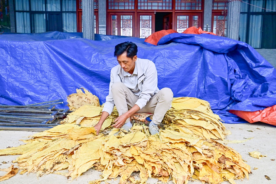 烟农杨会才正在分级烤烟(8月25日摄)。