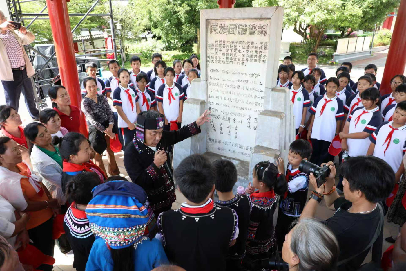 9月20日,在位于云南省宁洱县的民族团结誓词碑前,碑文镌刻者之一、当年盟誓代表的后代方财兵,正深情地向来自各族的群众和青年学生们讲述着那段跨越时空的民族团结佳话。