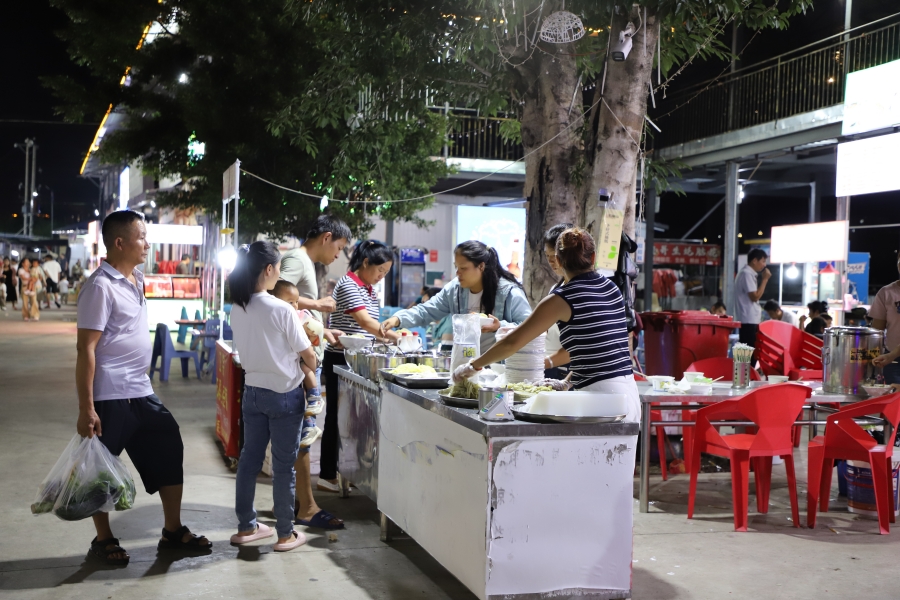 走进蒙姑镇文笔社区夜市,240米长的街道被科学划分为蔬菜区、水果区、美食烧烤区,114个摊位在3500平方米的硬化路面上整齐排列。社区不仅新增6盏路灯让夜市变得明亮,还规划出专用停车场,解决了消费者“停车难”的后顾之忧。这种“颜值”与“内涵”的双重提升,让夜市从零散摊贩的聚集地蜕变为集消费、休闲于一体的生活空间,更成为蒙姑镇农文旅融合的新亮点。