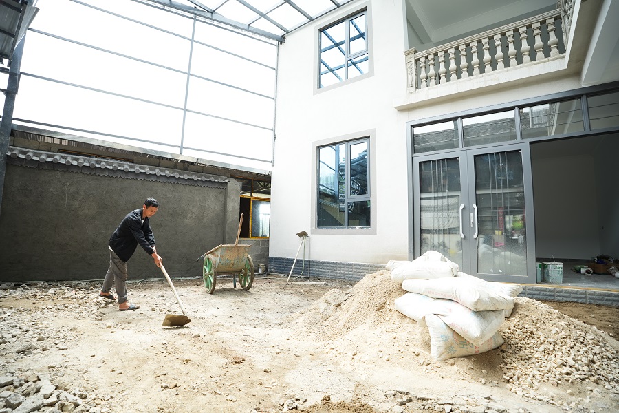 李学宽打理自己的新家(8月20日摄)。