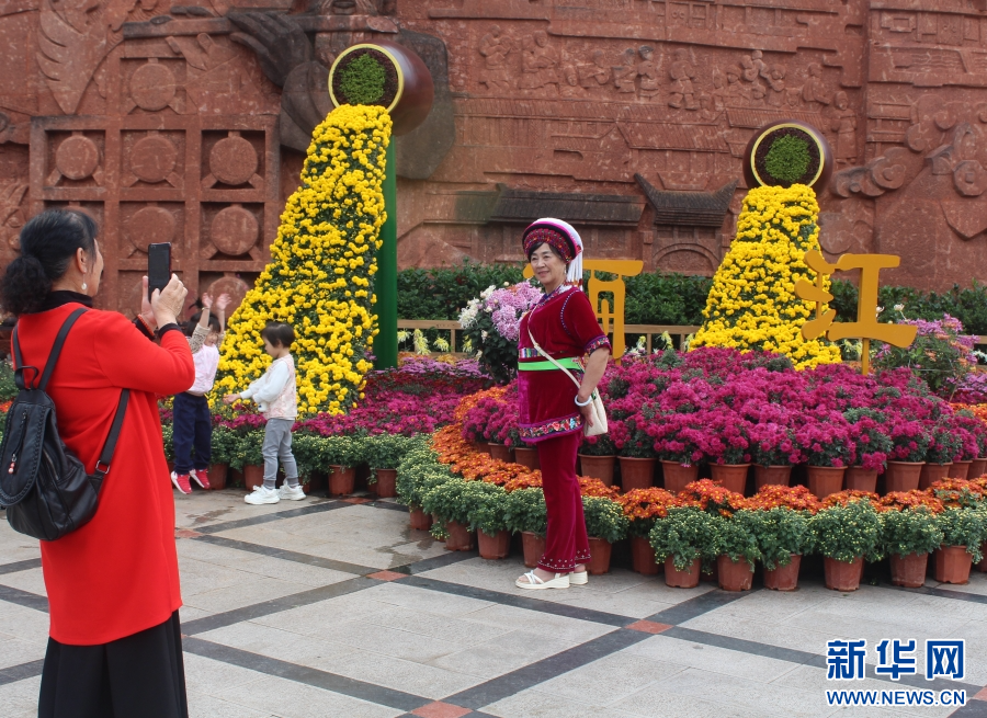 游客在丽江古城赏菊留影(9月29日摄)。新华网发