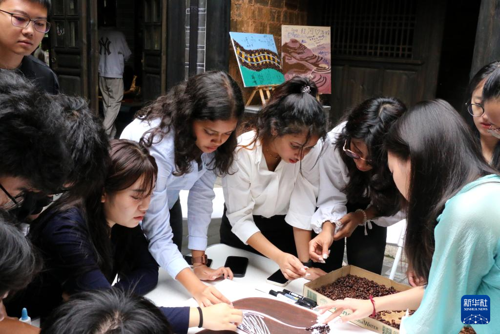 青年学子在咖啡渣循环艺术展上进行艺术创作。新华网发(蒙自市委宣传部供图)