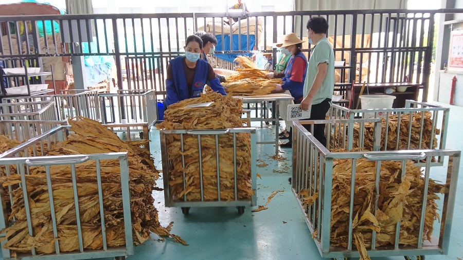 张映美参与烟叶收购工作,实现家门口就业(9月20日摄)。张成志 摄