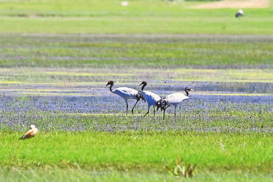 黑颈鹤在纳帕海湿地觅食。通讯员 陈志明 摄
