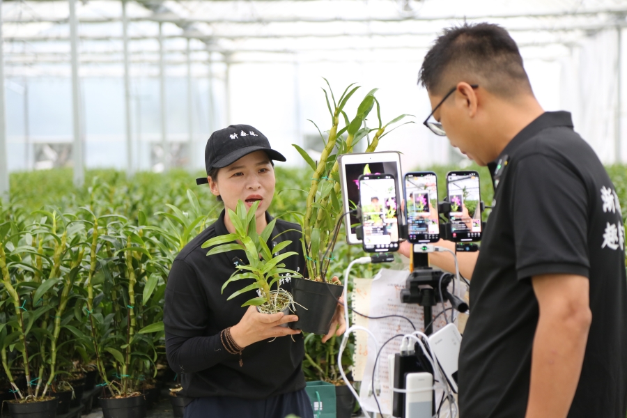 石斛大棚里,主播正在实地直播带货石斛花卉(10月13日摄)。