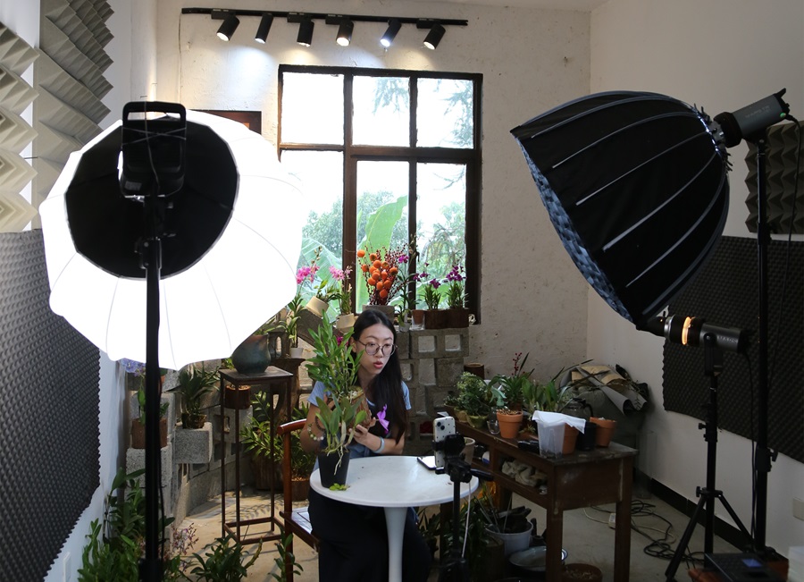 主播正在介绍石斛花卉(10月13日摄)。