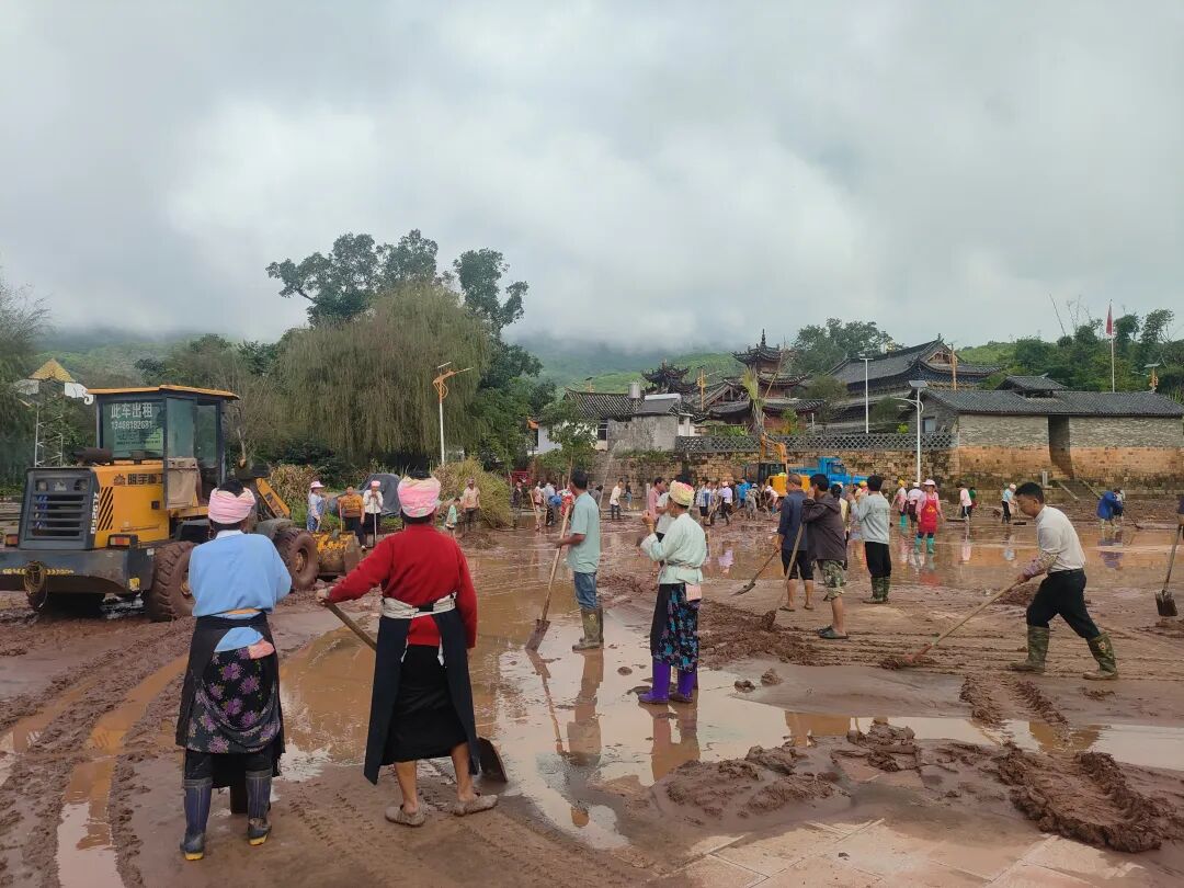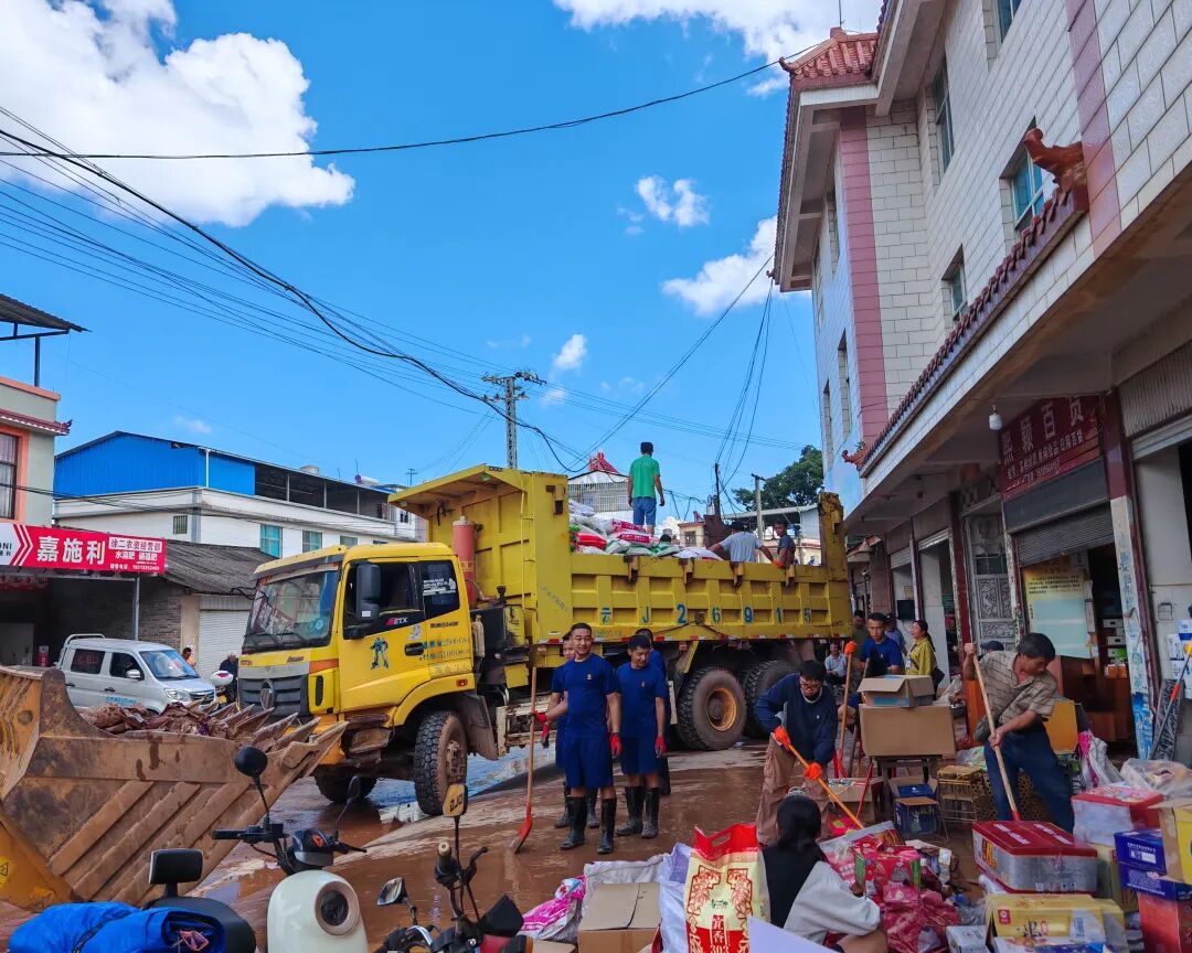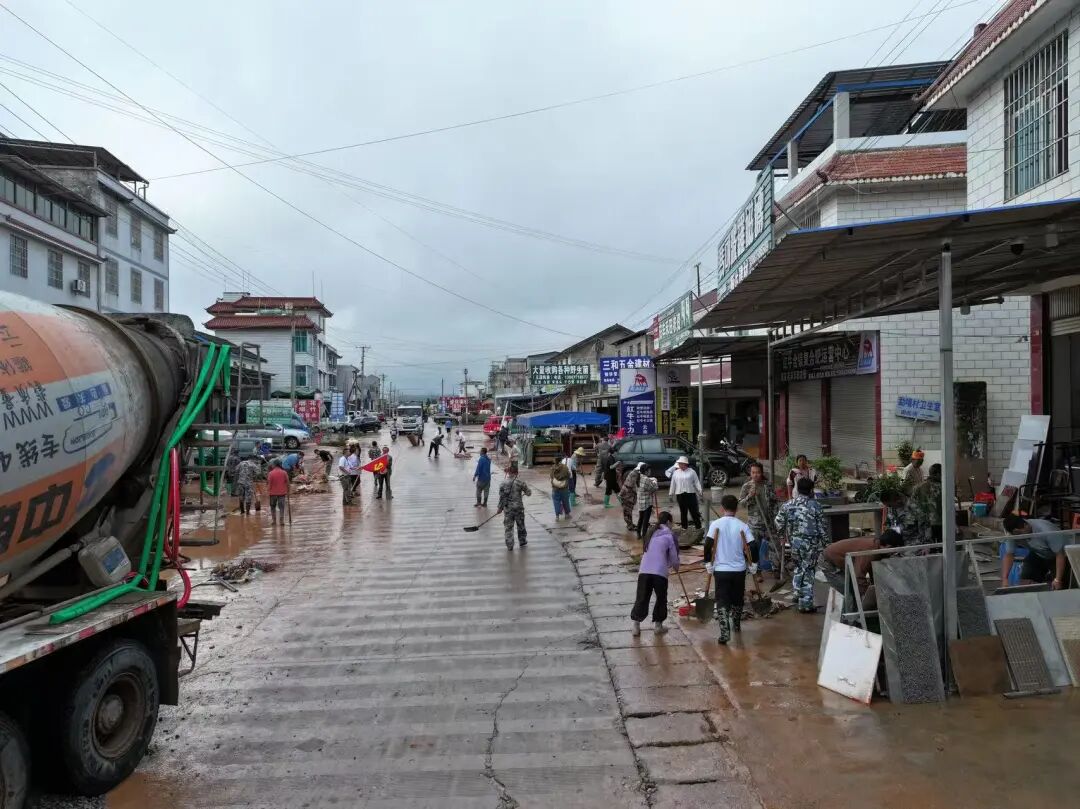 党旗指引、众志成城,攻坚克难、恢复家园。永平镇以党建为纽带凝聚党群干群合力,组建“党员先锋队+机关干部+村(社区)工作人员+志愿者+群众”的清淤复产队伍,分片包干投入灾后重建。党员干部带头扛起铁锹、拿起锄头、推起手推车,沿街清理主次干道淤泥与杂物;志愿者协同消防队及村民疏通堵塞沟渠、清扫院落积水,帮助商户冲洗门店恢复经营;机械救援组持续调度装载机、挖掘机,清理浸水车辆,对坍塌村组道路开展碎石清运与基础平整,同步排查修复受损供水管道与电力线路。目前,集镇核心区域已恢复正常通行,在党群干群同心协作下,家园重建正稳步推进。