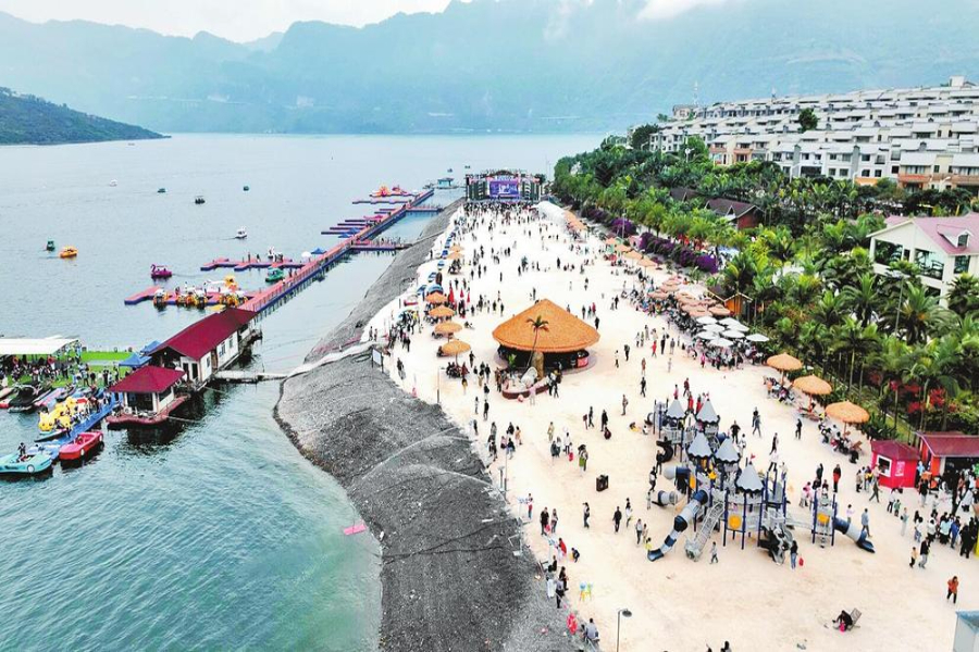 利用一江分界、三面环水、半月临江的地理优势,邵女坪将绵延水岸线化作天然画布,打造极具海滨感的文旅场景:水景民宿推窗见江,露天泳池倒映蓝天白云,白浪沙滩复刻海滨乐趣,水上演艺厅好戏连台,观景游船带游客尽赏高峡平湖、浩渺烟波。