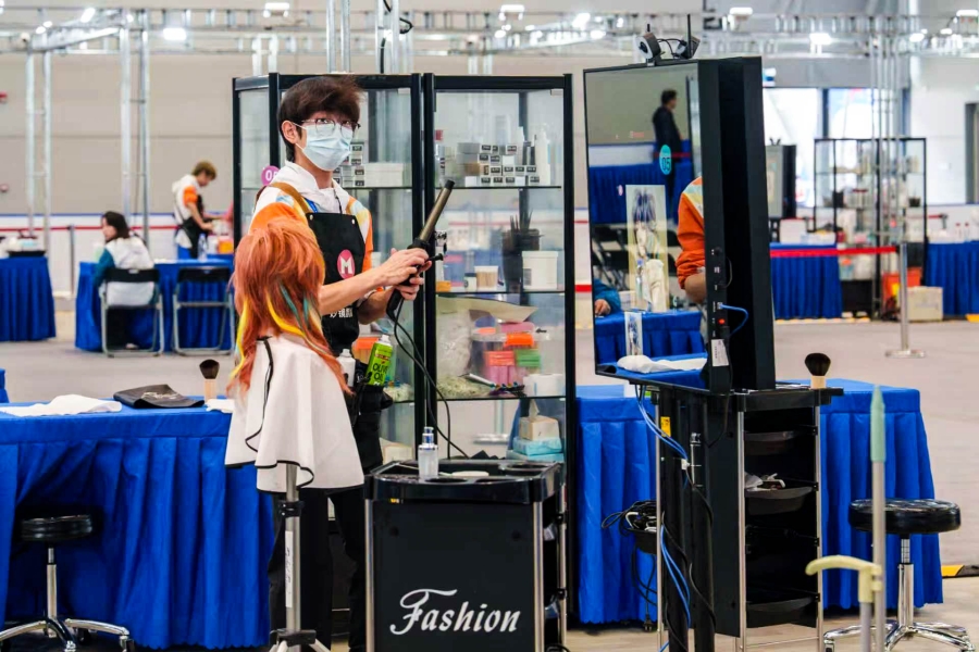 马世运在练习男士经典修剪技术技巧(10月20日摄)。