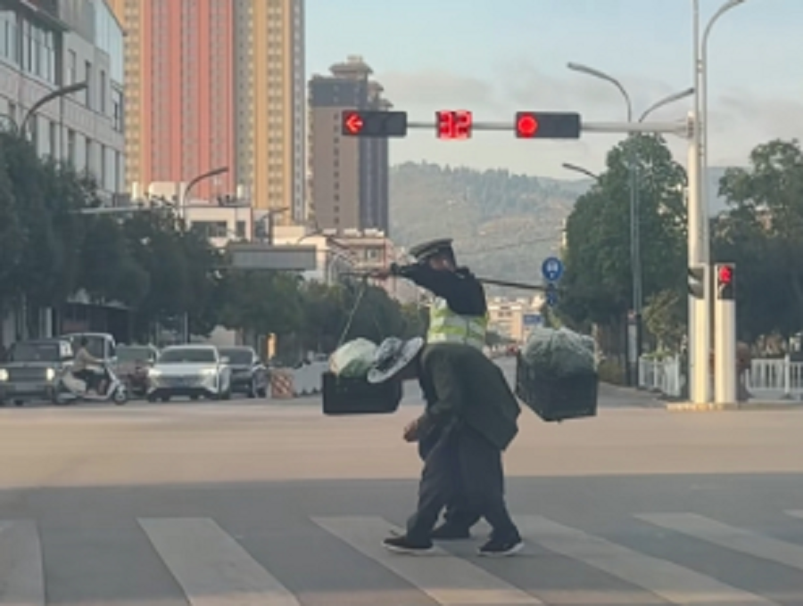 交警挑着担子的身影