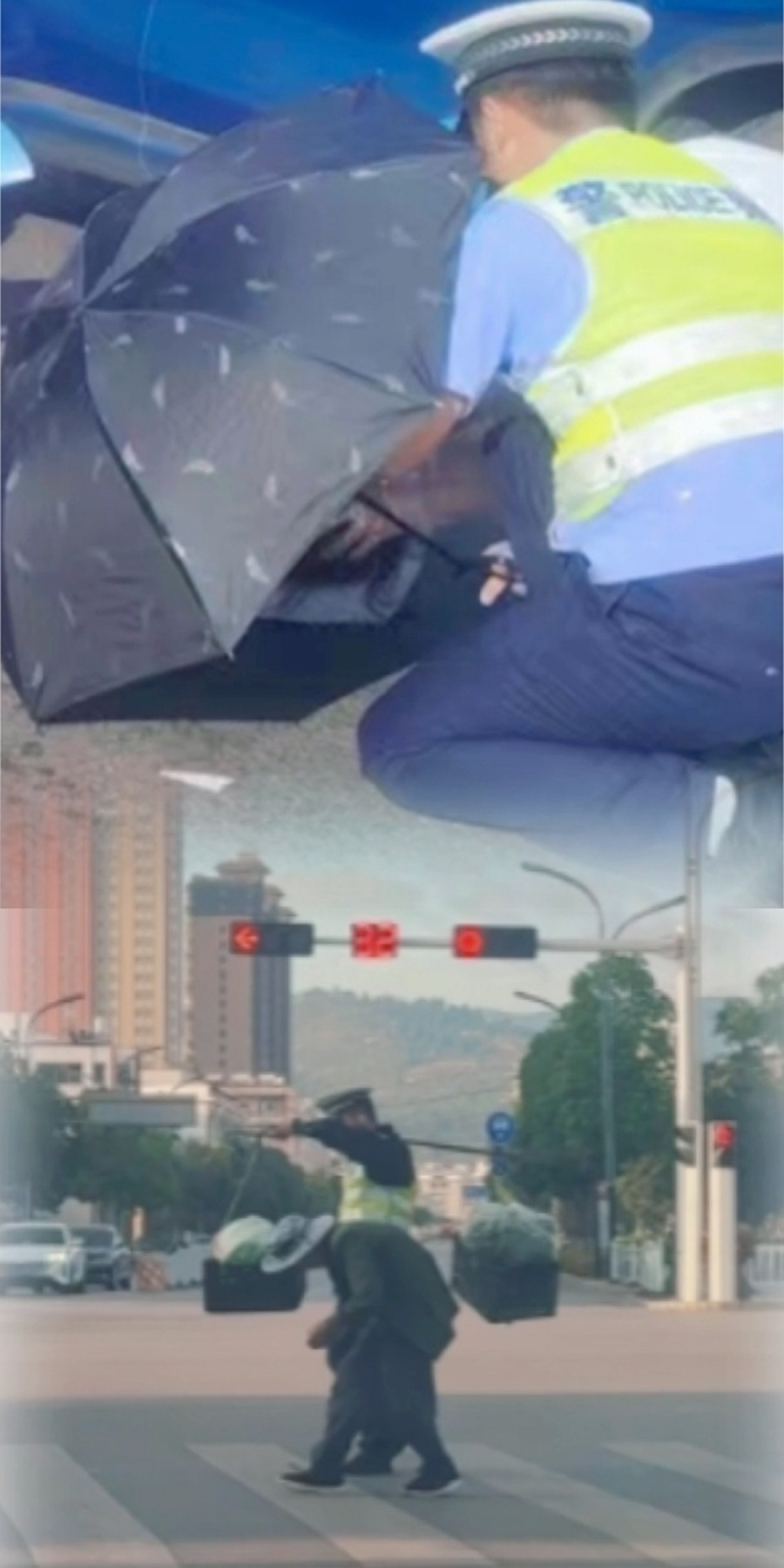 金鑫帮老人挑着担子并护送他过马路。