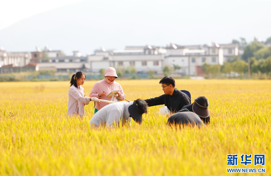 大理古生村科技小院的学生在稻田里测产(10月23日摄)。新华网 赵普凡 摄