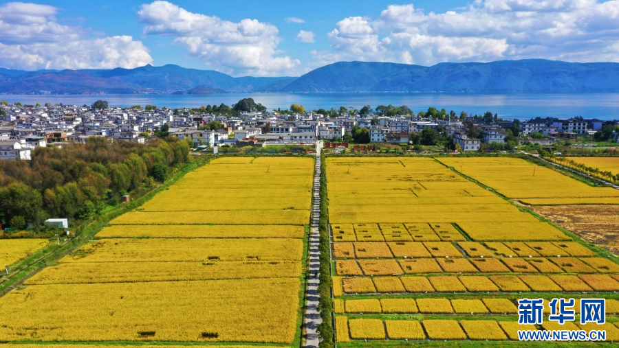 大理洱海、村庄、稻田相映成景(10月25日摄)。新华网 赵普凡 摄