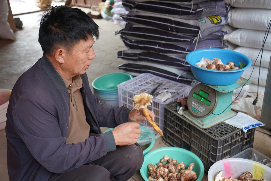 野生菌收购已成为张德明家的重要收入来源。由于本地自然资源优渥,野生菌产量极高,上山找菌已然成为一种热潮。每年6月至11月,他大量收购鸡枞、松茸、见手青等菌类,旺季时日均收购量达500公斤,收购的菌子统一交售到南华县野生菌交易市场。由于菌子收购量大,为此他还购置了两台烘干机进行初加工,制成干菌片提升附加值。