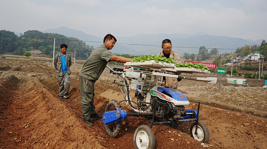 技术人员在现场会上演示并推广打塘移栽一体机(4月10日摄)。王垚 摄