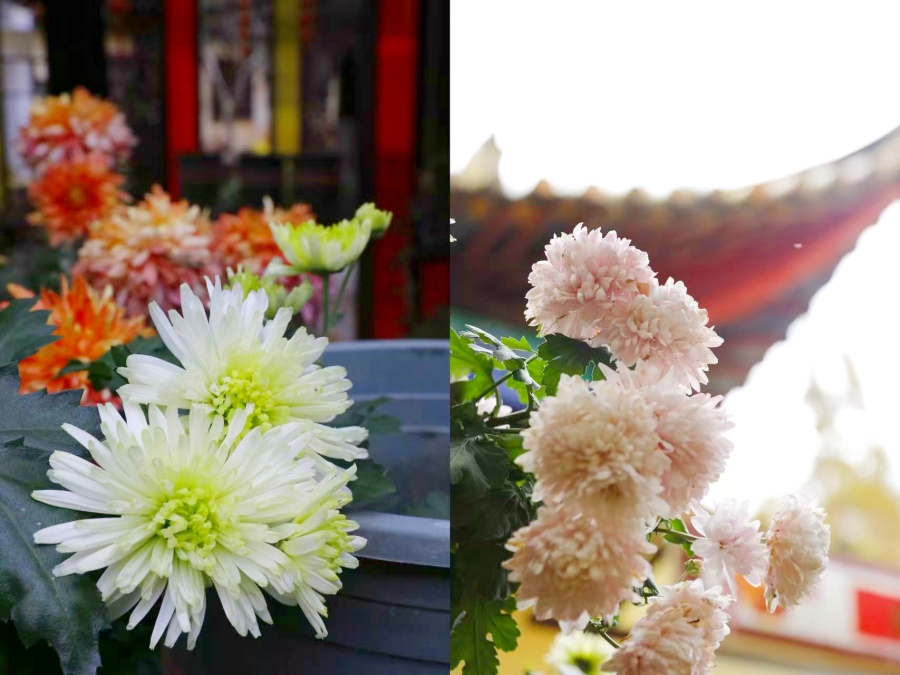 昙华寺菊花与建筑相映成趣(11月5日摄)。