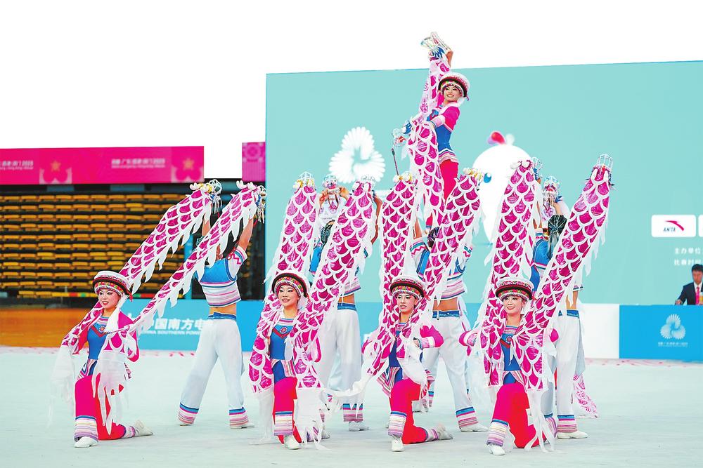 云南队在十五运会群众展演舞龙舞狮项目比赛中。记者 周灿 摄