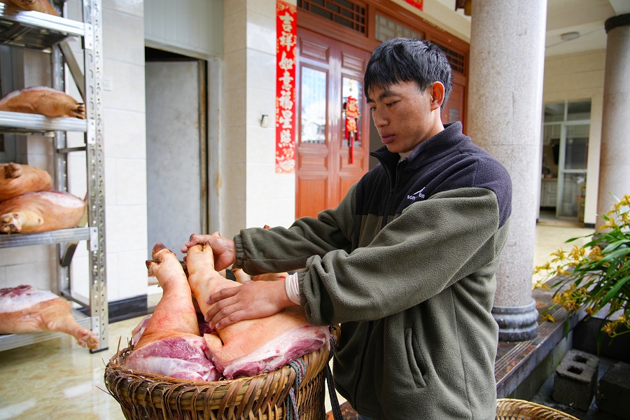 杨李忠的成功,带动了全村火腿产业的发展壮大。村民杨寿康便是受益者之一,他说:“我们家每年都养十来头猪,家里的火腿都送到杨李忠作坊,每年能有一万多块钱的收入。”