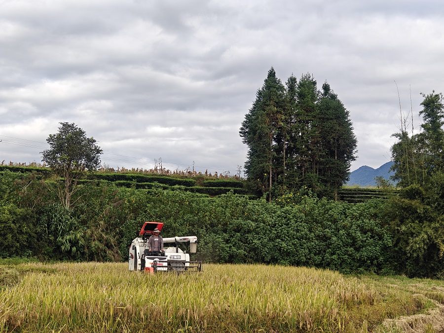 丙令村村民使用小型收割机采收“烟后稻”(11月5日摄)。黄泽宁 摄