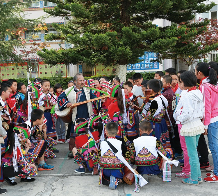 长期以来,石林县民族小学以社会主义核心价值观为指引,从中华优秀传统文化中汲取营养,不仅组建了《阿诗玛》展演队、摔跤队、刺绣队、三弦队、细乐队、狮舞队、鼓号队,还组织学生参加各类非遗传承活动,每周定期开展彝族刺绣、彝族摔跤、大三弦、狮虎舞、鼓号队、阿细器乐等训练,让孩子们从小就认识和学习传统民族器乐,促进孩子们全面发展。