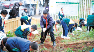 “我们的洋芋丰收啦!”在官渡区关上第二小学幸福邻里校区的劳动实践田里,五年级学生正在热火朝天地挖洋芋。
