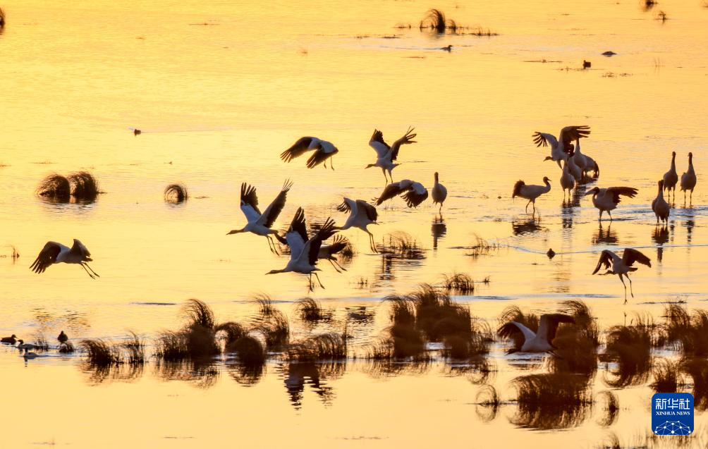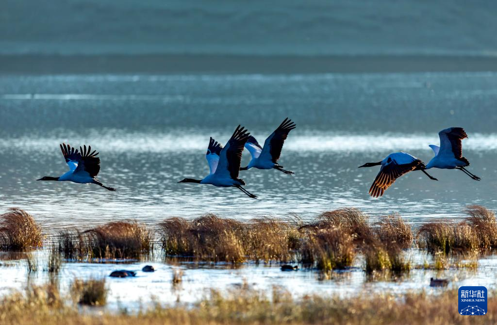 11月30日,黑颈鹤在大山包黑颈鹤国家级自然保护区内的大海子湿地飞舞。新华社发 (王长育 摄)