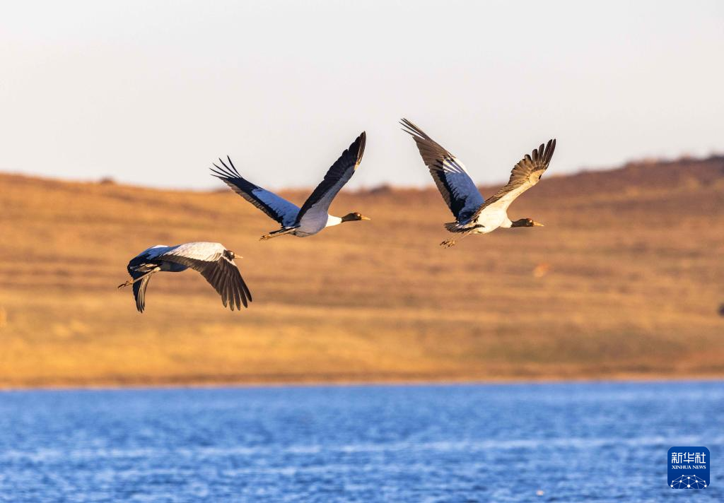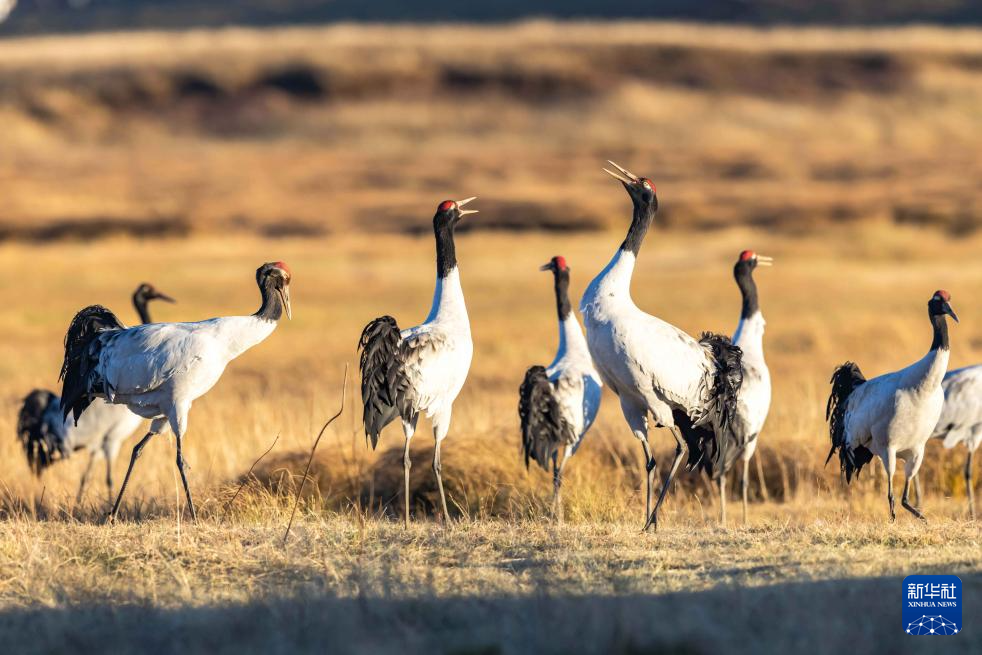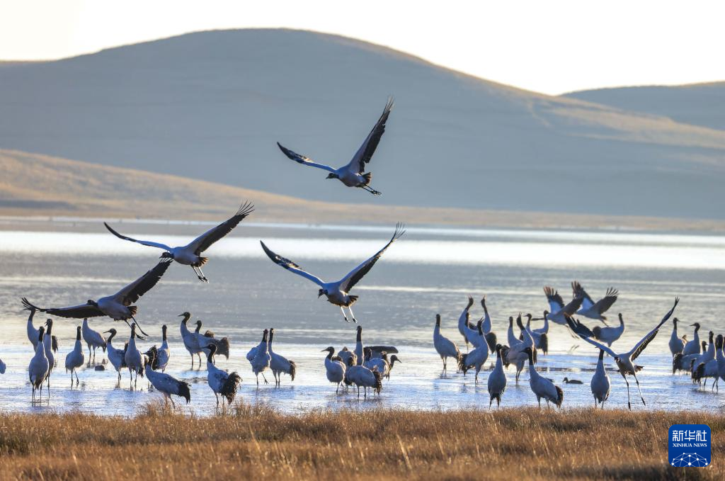 11月30日,黑颈鹤在大山包黑颈鹤国家级自然保护区内的大海子湿地飞舞。新华社发 (范晖 摄)