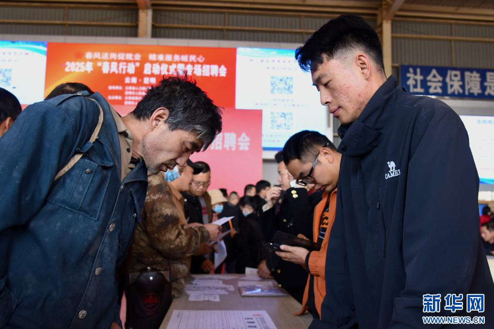 求职者在昆明市2025年“春风行动”启动仪式暨专场招聘会的展位前咨询岗位。新华社记者 熊轩昂 摄