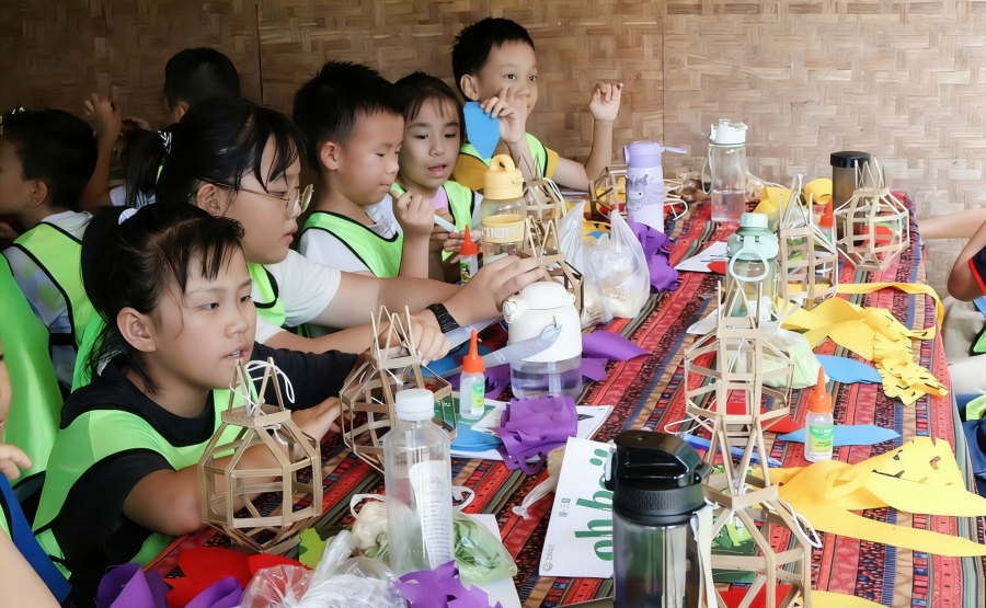 共青团西双版纳州委“团团陪伴·助力‘双减’”假期爱心托管班在“三曼”村开展研学制作灯笼(资料图)。