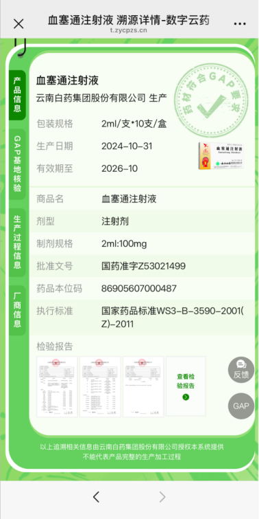 以血塞通注射液为例,质量管理延伸到了中药材种植源头,云南白药联动了云南省“链上慧眼监管平台”,构建了从中成药种植信息、生产工艺参数到制剂检测结果全链条数据可追溯的质量管理体系,实现了中成药从种植到提取再到制剂的数字化贯通,为药品安全筑起了一道坚实的防线。