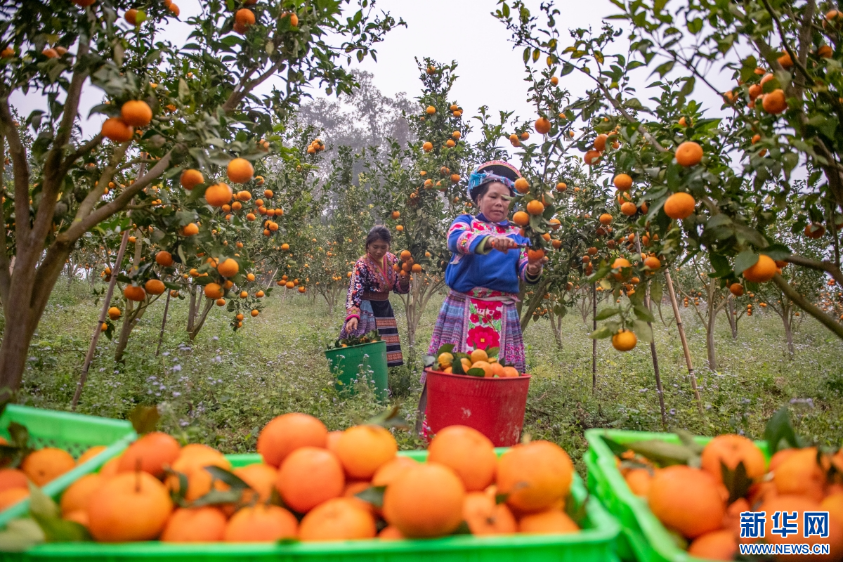 冬日里,云南省文山州马关县都龙镇的橘园基地里,饱满的橘子挂满枝头,果农们喜笑颜开,有条不紊地采摘、分拣、打包,一派丰收景象。(熊平祥)