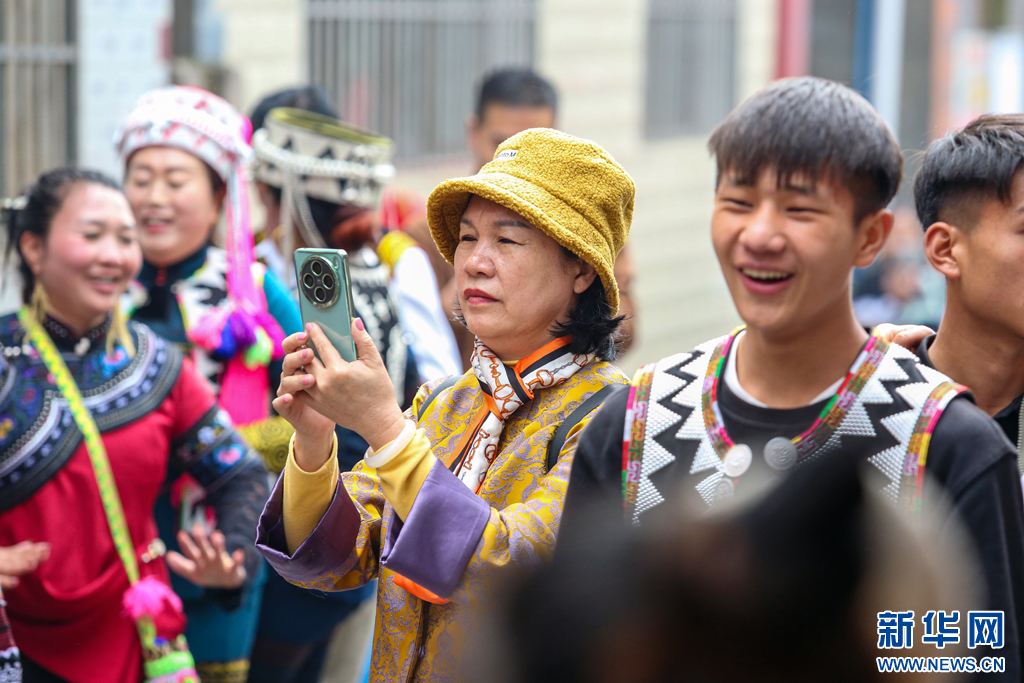 游客用手机拍摄哈尼长街宴(1月4日摄)。新华网发(张洪科 摄)