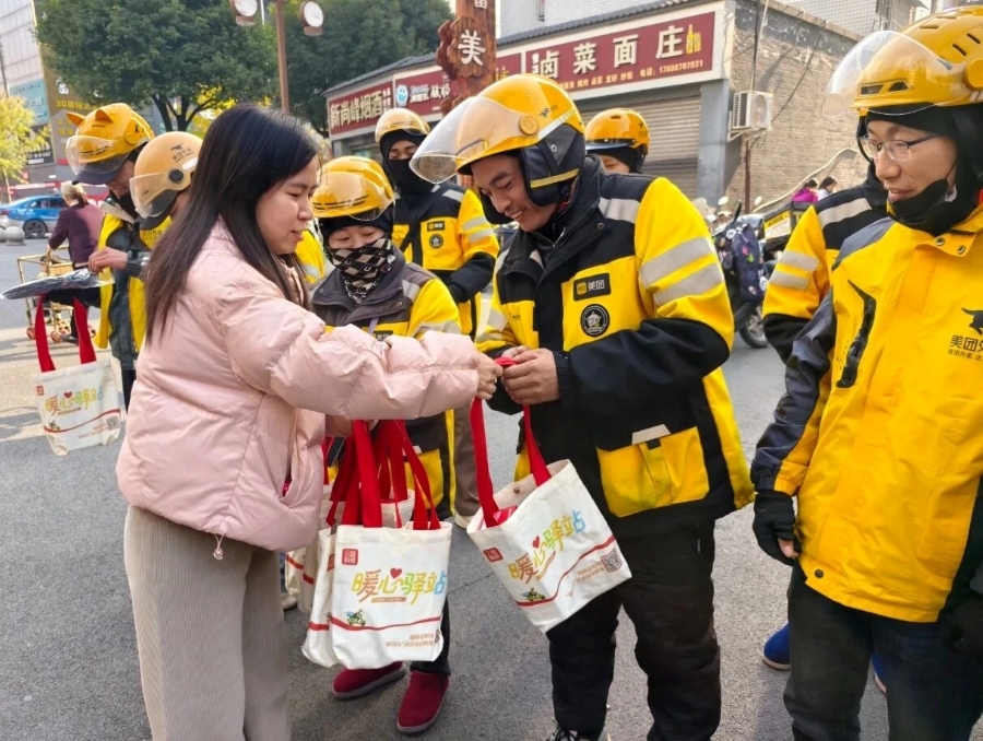 工作人员慰问外卖送餐员(2025年11月26日摄)。