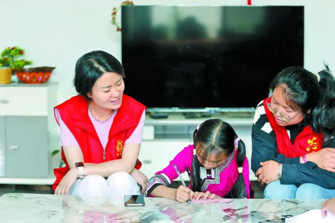 石林县“爱心妈妈”志愿者陪伴留守儿童。陈飞 张瑷妮 摄