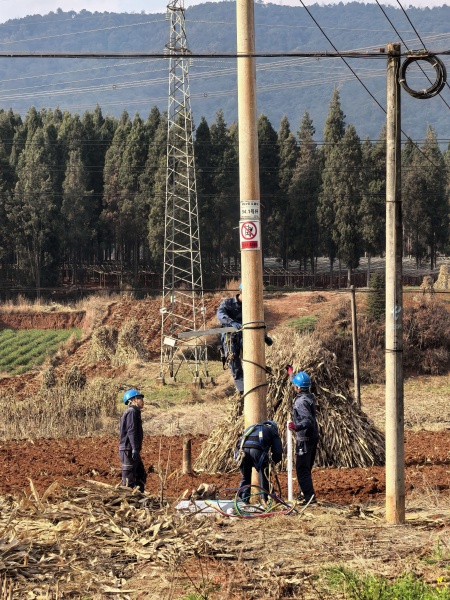 麒麟供电局东山供电所电力施工作业现场(1月10日摄)。