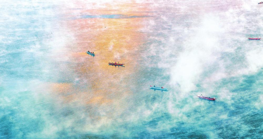 冬日清晨,泸沽湖在静谧中缓缓醒来,湖面升腾起轻柔的薄雾,将远山与湖岸轻轻包裹。晨雾中,摩梭人摇着船,唱着山歌,带着远方的客人沉浸式体验“人在画中游”的诗情画意。(记者 陈飞 摄)